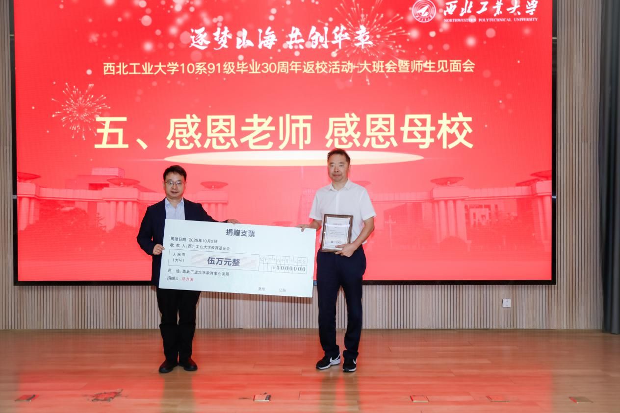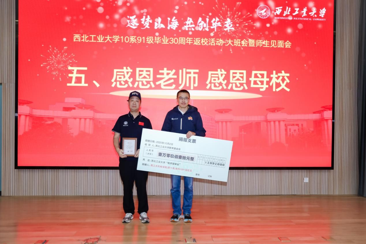 校友周期间,学院还组织了系列专题活动,包括学院参观、师生见面会及校友学术交流会等。其中,1091级全体校友在航空楼环D报告厅举办了师生见面会,教师代表王润孝、冯学廉、苑伟政、余隋怀、侯沛勇、杨斌堂、崔新,校友会秘书长杨铭及学院领导参会。机电学院院长常洪龙在会上为校友们介绍了近年来学院的发展与取得的成就,并诚挚邀请广大校友常回家看看,继续关注支持母校的发展建设。91级代表教师,辅导员和返校同学也纷纷上台发言,深情回顾往昔岁月,讲述难忘师生情谊,现场气氛温馨动人。会上还举行了捐赠仪式,1091级校友邓方涛个人向学校教育基金会捐赠人民币5万元,全体1091级校友共同捐赠人民币1.091万元,象征全体1091级学子的共同心意,杨铭代表校友基金会接受捐赠。此笔款项将专项用于“教师健康金”,凝聚了校友们感念师恩、心系母校的深厚情谊。