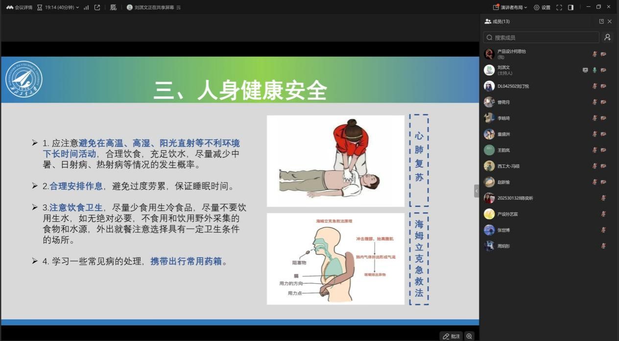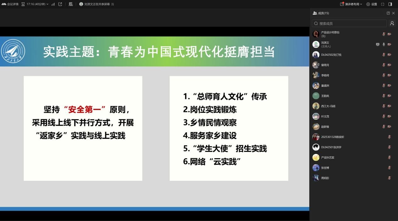 本次会议刘淇文首先围绕“青春为中国式现代化挺膺担当”主题,详细解读了本次寒假社会实践的核心内容与目标。本次实践采取“线上线下并行”模式,涵盖六大主题。同时,会议结合冬季出行特点,从制度规范、交通出行、人身健康、防范滋扰四个方面开展专题安全教育,提醒同学们做好行前准备,保持通讯畅通,遵守法律法规,确保平安实践。