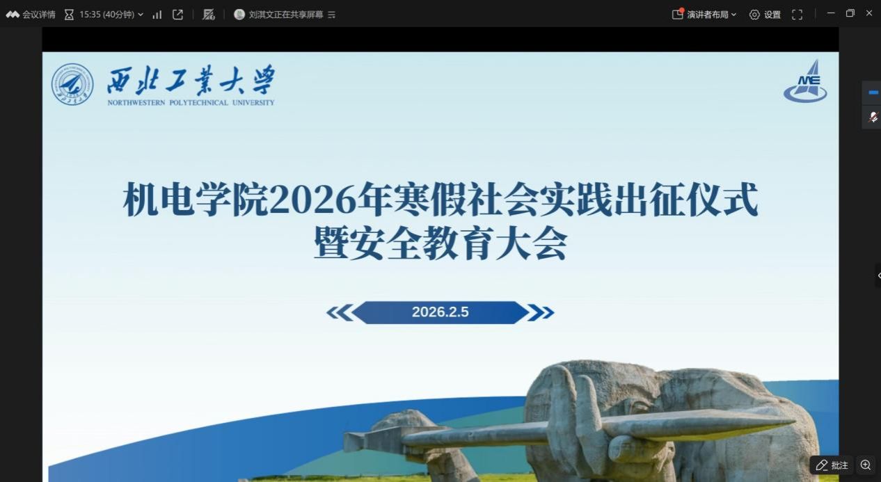 为深入学习贯彻党的二十大精神,引领青年学生在社会实践中受教育、长才干、做贡献,2026年2月5日,机电学院以线上形式召开2026年寒假社会实践出征仪式暨安全教育大会。由学院学生会主席团成员刘淇文主持本次寒假实践出征仪式,学院团委书记冯硕参与出席会议。